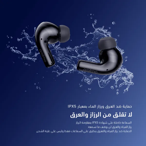 صُممت لمقاومة العرق ورذاذ الماء، مما يجعلها مثالية للتدريبات والمغامرات اليومية (الحماية تقتصر على السماعات وليس علبة الشحن).